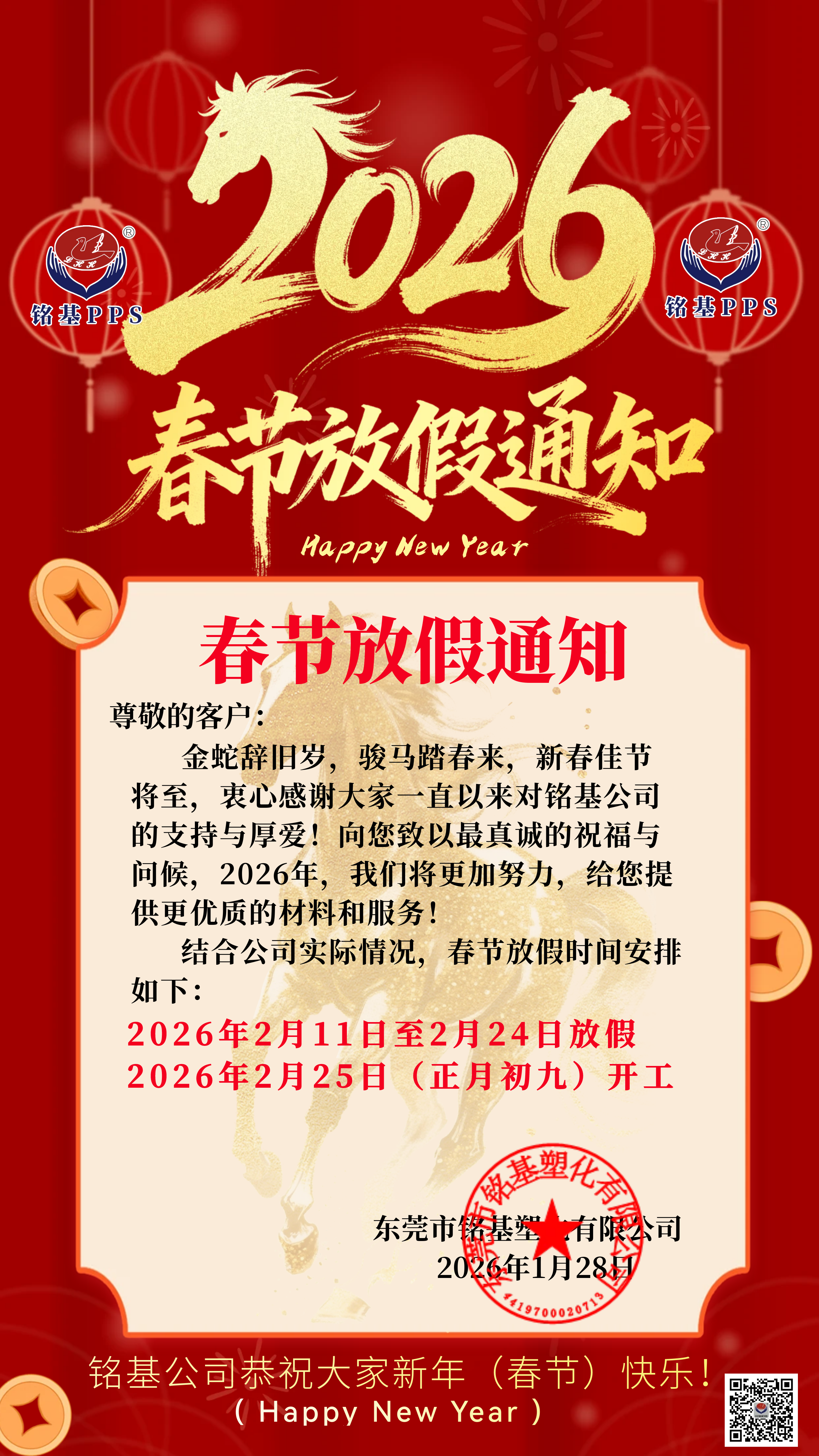 铭基PPS公司春节放假通知